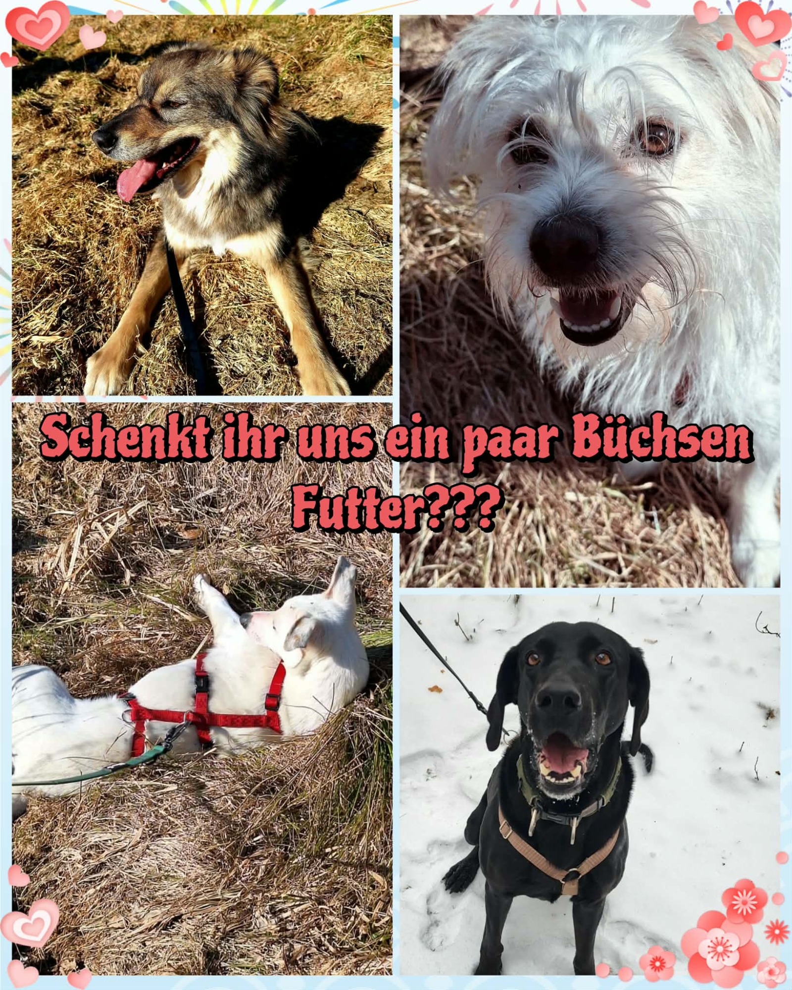 Wir möchten uns für jeden vom Herzen kommende Spende ganz lieb bedanken und würden uns riesig freuen wenn ihr unsere Fellnasen mit ein paar Büchsen Nassfutter unterstützen würdet. Möchtet ihr unsere Hunde mit Futter überraschen und ihnen einen vollen Futternapf schenken???